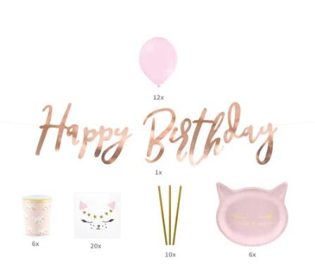 Poglądowe zdjęcie produktu. Uszkodzone opakowanie. Zestaw dekoracji party - KotekZestaw zawiera: baner Happy Birthday (1 szt.) kubeczki papierowe (6 szt.) talerzyki papierowe (6 szt.) słomki papierowe (10 szt.) serwetki papierowe (20 szt.) balony lateksowe (blady róż, 12 szt.) Produkt może mieć uszkodzone opakowanie lub naruszoną plombę fabryczną opakowania. Uszkodzenia nie wpływają na funkcjonalność produktu.