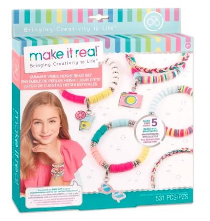 Zestaw kreatywny do bransoletek Make It Real, Summer Vibes HeishiZestaw do bransoletek to propozycja stworzona przez popularną markę Make It Real, skierowana w stronę początkujących projektantek i artystek. Zawiera wszystkie najpotrzebniejsze przedmioty potrzebne do zrobienia bransoletek z kolorowych koralików.