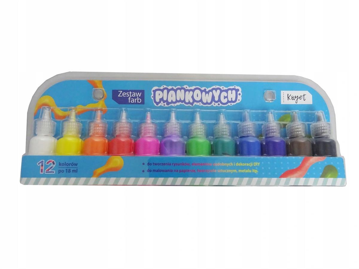 Zestaw farb piankowych 12 szt. w opakowaniu piękne intensywne kolory każda tubka o pojemności 12 ml. do tworzenia rysunków, elementów ozdobnych i dekoracji DIY do malowania na papierze, tworzywie sztucznym, metalu itpEgzemplarze powystawowe - opakowania mogą zawierać zbite rogi, rozdarcia, przybrudzenia, rysy.