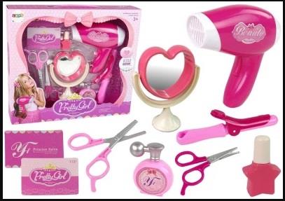 Zestaw Piękności Dla Małej Damy Akcesoria Fryzjerskie + Suszarka z szumem na baterie ! Świetny zestaw do stylizacji włosów dla małej damy. Znajdziemy tu wszystkie niezbędne do zabawy w salon fryzjerski akcesoria . Zestaw doskonale nadaj się dla dziewczynek, które lubią zabawy w stylizacje fryzur. Dzięki temu zestawowi wyczarują nowe, świetne fryzury rozwijając swoje zdolności manualne i kreatywność ! Fryzury można urozmaicić pozostałymi akcesoriami dołączonymi do zestawu. Zabawę uatrakcyjni wydająca dźwięk prawdziwego suszenia suszarka do włosów. Zasilana bateria AA (brak w zestawie). W zestawie znajdziemy: - Suszarkę z dźwiękiem suszenia - Ruchome lusterko w kształcie serca z podstawką - Lokówkę do Włosów (imitacja) - Spray do włosów (imitacja) - Dwa rodzaje nożyczek do włosów (imitacja) - Lakier (imitacja) Zestaw doskonały na prezent, zapakowany w kartonowe pudełeczko. Wiek: od 3 lat Świetna propozycja zabawy w salon fryzjerski Wymiary opakowania ok.: 34 cm x 30 cm x 7 cm