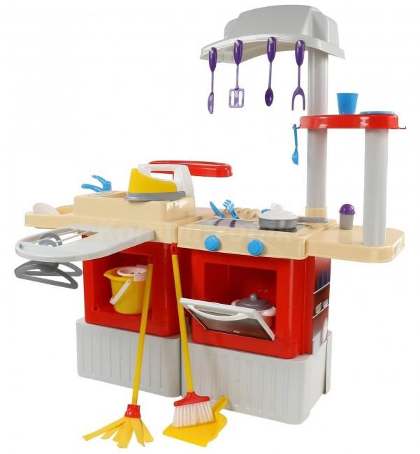 Kuchnia dla dzieci InFinity posiada płytę do gotowania, piekarnik, zlewozmywak z kranem, suszarkę do naczyń. Wzbogacona została również w kącik do prasowania na który składa się szafka, rozkładana deska i żelazko, a także sprzęt do sprzątania (mop, wiadro, szczotkę i szufelkę). Oprócz tego zestaw zawiera dodatkowe akcesoria jak: wieszaki na ubrania, talerze, garnki i sztućce. Produkt zatem jest wyposażony we wszystko, co umożliwia dobrą zabawę. Jego wielozadaniowość z kolei przedłuży jej czas.