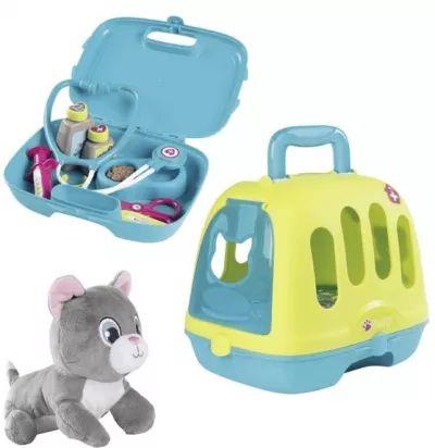 Każdy młody weterynarz zawsze jest przygotowany na wszystkie problemy swojego pupila. Uroczy pluszowy kot wydający dźwięki, miauczy i mruczy jak się go głaszcze oraz mlaszcze jak je, dzięki kontenerowi ma wszystko czego potrzebuje. W kontenerku możemy go przenosić a w razie problemów w walizeczce młody weterynarz znajdzie między innymi: stetoskop termometr strzykawkę pojemniczki miseczkę na karmę i wodę Wymiary: 25,4 x 19,4 x 20,1 cm Uwaga! Produkt nieodpowiedni dla dzieci poniżej 3 roku życia.