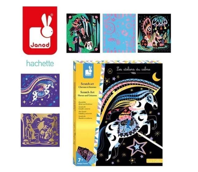 Zestaw kreatywny Do zdrapywania Konie i jednorożce francuskiej marki JANOD zawiera 8 plansz z solidnego kartonu, przedstawiających magiczne życie koni i jednorożców, m.in. podniebną podróż czy kąpiel w leśnym jeziorze. Obrazki są pokryte jednobarwną warstwą wierzchnią z konturami elementów, które ukazują się stopniowo w efekcie jej zdrapywania. Do zestawu dołączony jest plastikowy patyczek. Zdrapywanie to dla dziecka długie godziny angażującej i jednocześnie uspokajającej, wyciszającej zabawy, a gotowe dzieła mogą stać się wspaniałą dekoracją dziecięcego pokoju. Zestaw zaprojektowano we Francji we współpracy z francuską grupą mediową i wydawniczą Hachette. Zapakowany jest w stylowe kartonowe pudełko. Idealnie nadaje się na prezent.