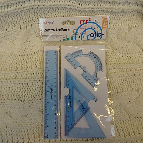 ZESTAW KREŚLARSKI- NIEBIESKI. Zestaw zawiera 1 linijkę,1 kątomierz, 2 ekierki. St. Majewski.