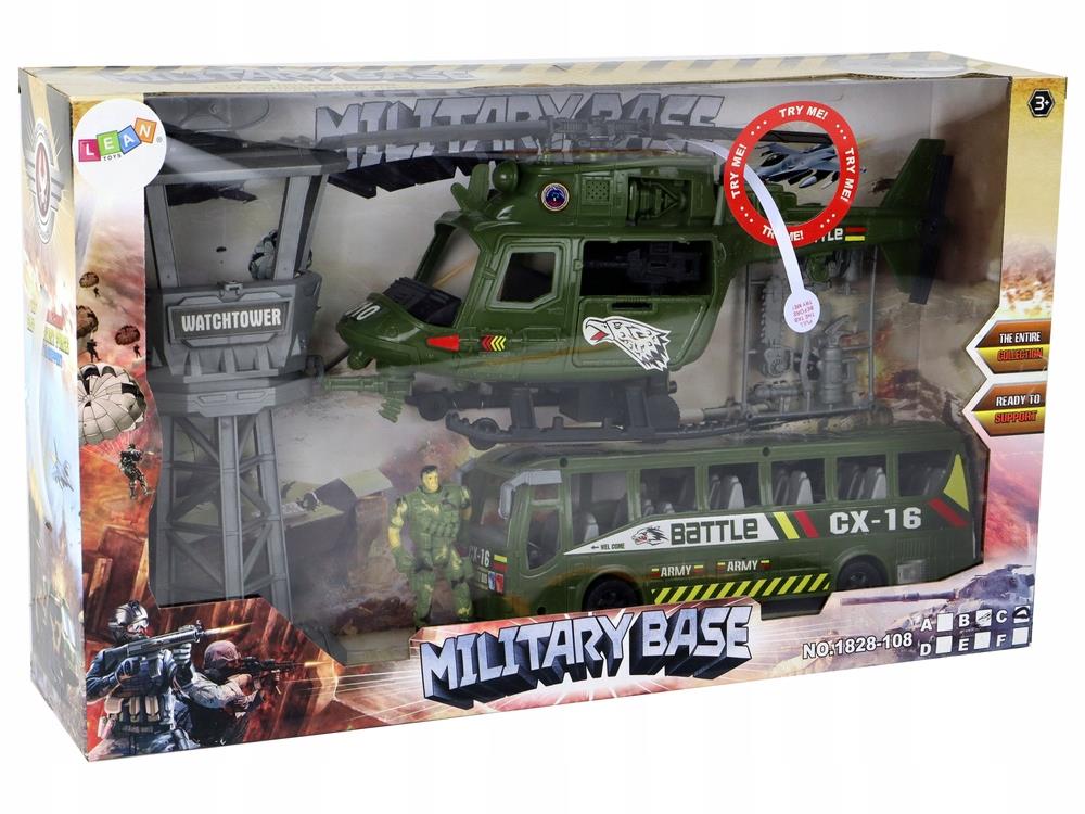Zestaw zawiera: Helikopter Wojskowy z efektami świetlnymi i dźwiękowymi Wóz Wojskowy Wieżę obronną Figurki żołnierzy Dodatkowe akcesoria, które urozmaicają zabawęWszystkie elementy zestawu wykonane są z wysokiej jakości, atestowanych materiałów, co zapewnia trwałość i bezpieczeństwo podczas zabawy. Stonowane, wojskowe kolory elementów pomagają w kamuflażu, co dodaje realizmu i pozwala na ciekawe scenariusze zabawy.
