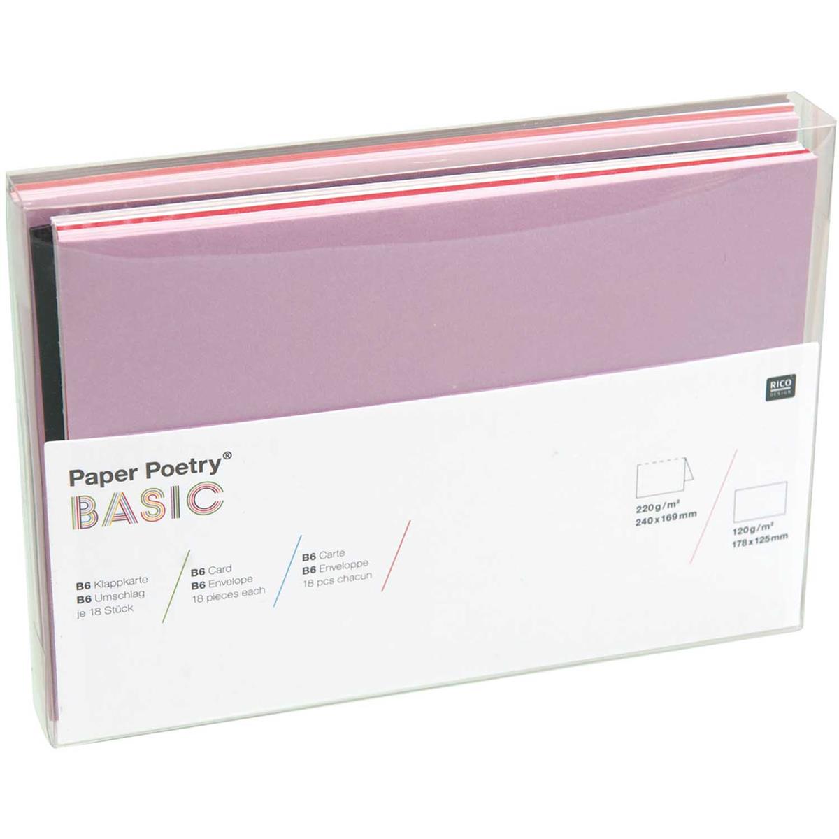 Seria Paper Poetry Basic to nasza standardowa seria, idealna na kartki okolicznościowe, zaproszenia lub kartki z podziękowaniami. Praktyczne karty i koperty są dostępne w wielu jaskrawych kolorach i nadają się do zadrukowania. Gramatura: koperty 120 g/m², karty 220 g/m² szyte wiązanie Zawartość: 18 kart i 18 kopert w różnych kolorach Format: DIN B6, karty: 240 x 169 mm, koperty: 178 x 125 mm