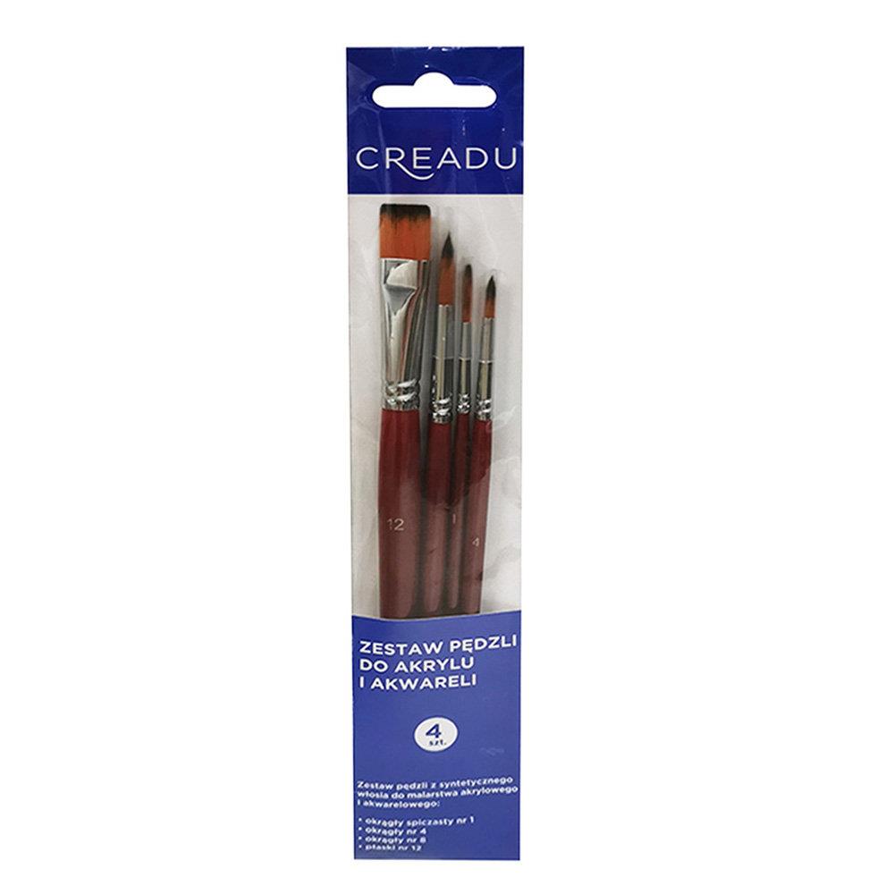 zestaw pędzli zawiera: 4 sztuki przeznaczone do farb akrylowych i olejnych syntetyczne włosie drewniany uchwyt rozmiary: 1, 4, 6, 12