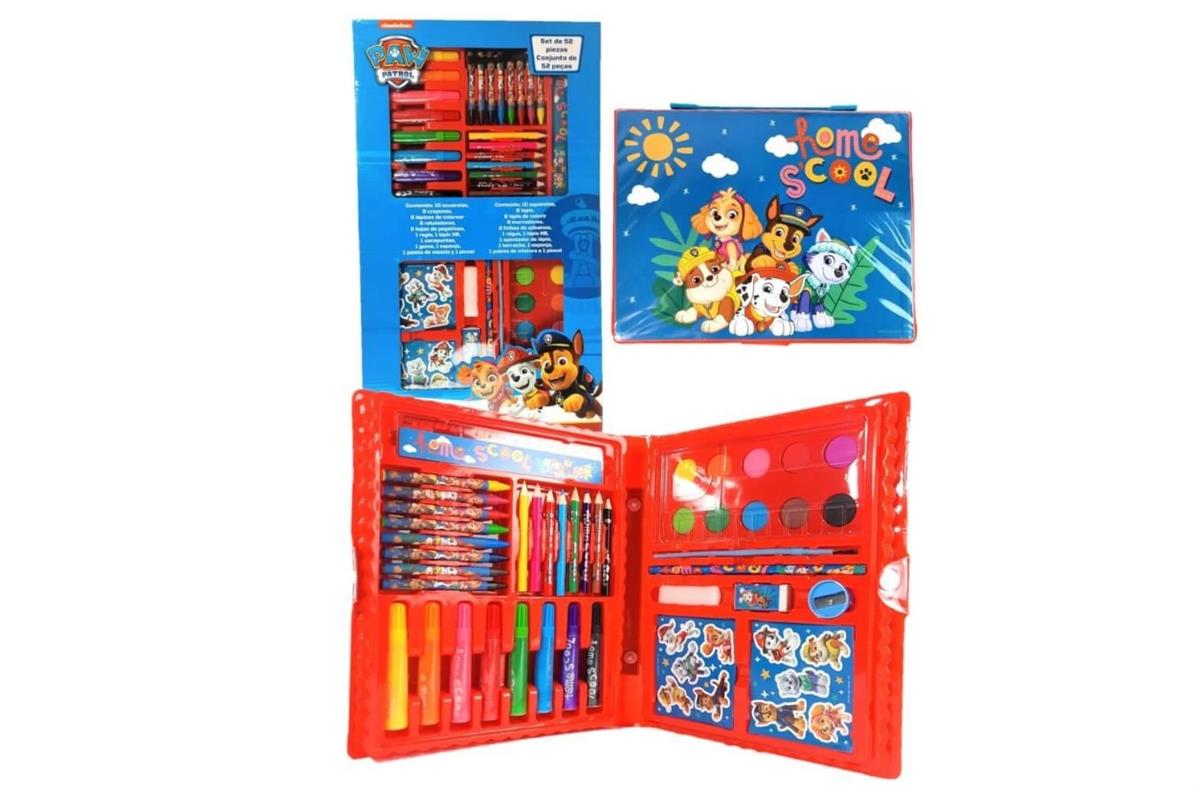 Zestaw zawiera 52 elementy 10 kolorów farbek, każda w innym kolorze 8 kredek ołówkowych 8 kredek świecowych 8 flamastrów 2 arkusze po 5 naklejek z postaciami piesków linijka ołówek HB temperówka gumka gąbka oraz pędzelek