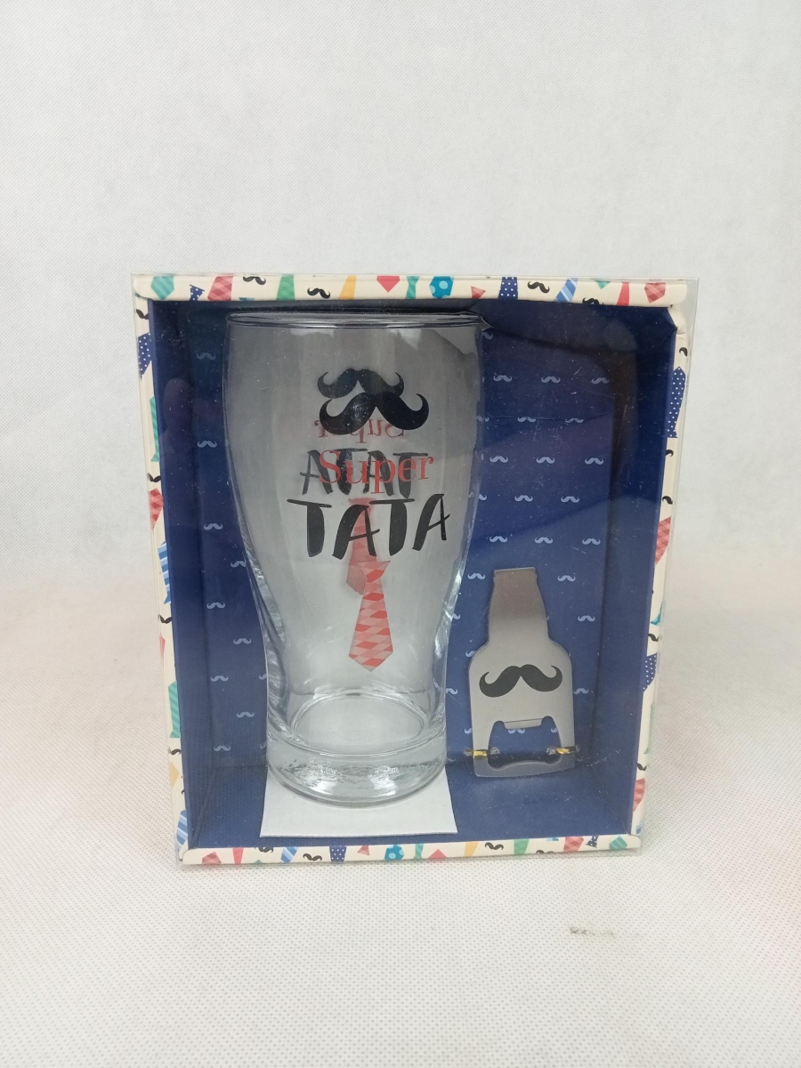 zestaw prezentowy z limitowanej kolekcji Dnia Tatyszklanka do piwa z napisem: ,,Super TATA kolor: bezbarwnymateriał: szkłowymiary: 16x7,5 cmpojemność: 580 mlotwieracz w kształcie butelkikolor: srebrnymateriał: metalwymiary: 8x3,5 cm Produkt może mieć uszkodzone opakowanie lub naruszoną plombę fabryczną opakowania.