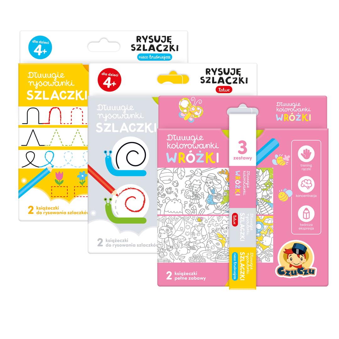 Kreatywny zestaw rysowanek2x Dłuuugie rysowanki Szlaczki + Dłuuugie kolorowanki WRÓŻKIdla dzieci w wieku 4+Kredki w dłoń, czas kontynuować przygodę z kredkami. Rysujcie szlaczki i kolorujcie Wróżki!Kreatywny zestaw zawiera 3 tytuły: Dłuuugie rysowanki Szlaczki Łatwe, Dłuuugie rysowanki Szlaczki Nieco trudniejsze oraz Dłuuugie kolorowanki Wróżki.To w sumie 6 długich książeczek harmonijek z mnóstwem kreatywnych i edukacyjnych zadań.zestaw zawiera 6 książeczek harmonijekopakowanie o wymiarach 18 x 20 x 1,5 cmdługość książeczki: 96 cmodpowiednie dla dzieci w wieku 4+ilustracja i forma jest dostosowana do wieku dzieckazabawa rozwija małą motorykę, kreatywność i logiczne myślenie