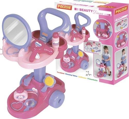 Zestaw SALON PIĘKNOŚCI DIANA to specjalny wózek, w cudownie różowym kolorze służący do przechowywania i transportowania niezbędnych akcesoriów małej modnisi. Wyposażony jest w dwa szerokie koła gwarantujące mu stabilność. Wygodna, duża rączka ułatwia z kolei przemieszczanie go. Przy niej umieszczono głęboki pojemnik oraz szeroką, płytką półkę. Przy samych kołach również jest miejsce przeznaczone na niezbędne bibeloty. Do zestawu dołączono również: duże lusterko (przytwierdzone do górnej półki), suszarkę, dwa pojemniki na kosmetyki, przenośne, mniejsze lustereczko, szczotkę, grzebień oraz dwie bransoletki.