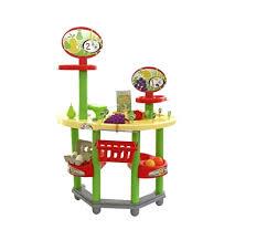 W zestawie:-stoisko kasowe z ladą-liczne półeczki z cenami-pojemniki do ekspozycji artykułów spożywczych-kasę-monety-koszyk na zakupy-owoce, warzywa, art. spożywcze Egzemplarze powystawowe- opakowania mogą zawierać rozdarcia, przybrudzenia, rysy.