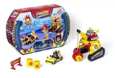 Zestaw zawiera: 1 kierowc, 1 ekskluzywny pojazd T-Racers, 1 dźwig, 1 płotek, 3 baryłki.
