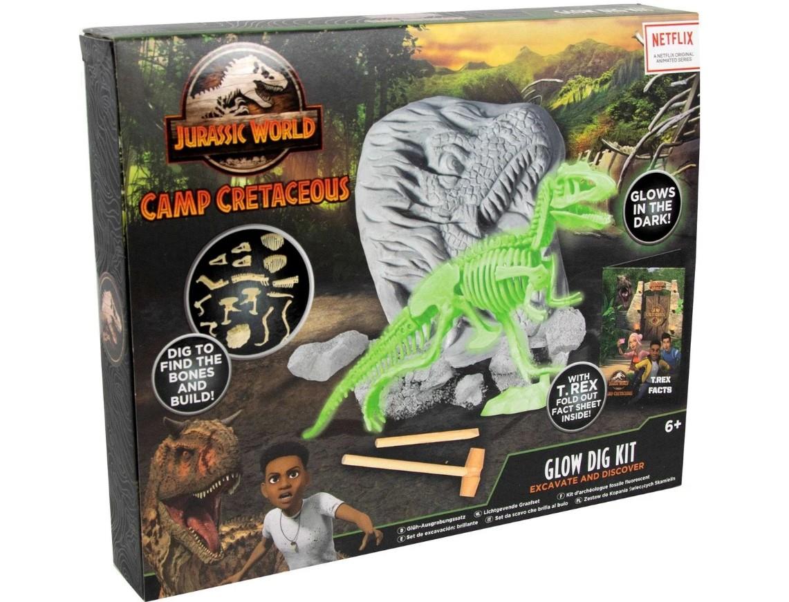 Zestaw wykopaliskowy do wykopywania skamielin Jurassic World świecący w ciemności dinozaurFigurka została stworzona przez znaną firmę RMS. Zabawka ta pochodzi z filmu Jurassic World. Zestaw zawiera skałę, która wykonana w kształcie głowy dinozaura, a przy pomocy narzędzi trzeba wydobyć dinozaura, który po naładowaniu w słońcu - świeci w ciemności!