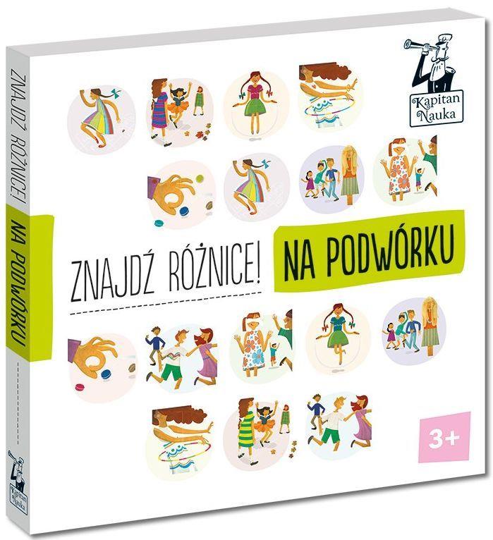 Pięknie ilustrowana książeczka Znajdź różnicę. Na podwórku zabiera dziecko na osiedlowy plac zabaw, gdzie czeka na nie wiele wciągających gier i zabaw! Zagraj w klasy, poskacz przez gumę, pobaw się w berka ? to tylko niektóre z zabaw znajdujących się w książce! Znajdź trzy różnice na obrazku i przekonaj się, czy jesteś małym bystrzakiem.