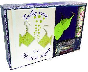Zawartość pudełka:- książeczka z instrukcjami wykonania 11 modeli biżuterii orgiami- 12 kolorowych kartek do składania- materiały do wykonania biżuterii (bigle, koraliki, szpilki, wstążki itp.)- prezent - gotowe kolczyki listki .